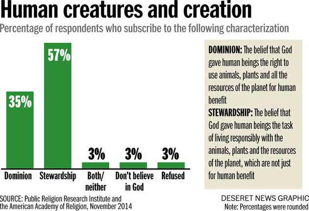 According to a November 2014 survey from Public Religion Research Institute, 57 percent of Americans espouse a stewardship mindset, believing that humans are called by God to live responsibly with plants, animals and earthly resources. Dominion thinking, which dominated global Christianity throughout the last four centuries and prioritizes human desires, is linked to just 35 percent of those surveyed.