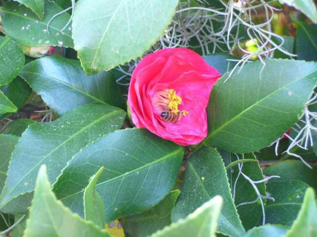 Frisky in the flowers A bee collects pollen and nectar from a camellia Monday afternoon in Bradwell Park.