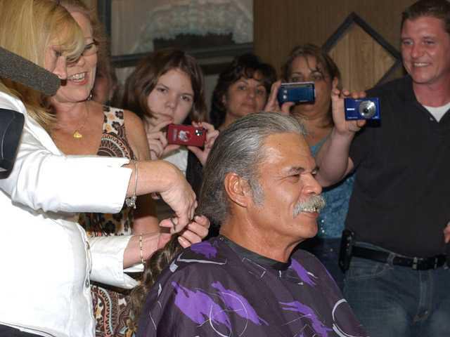 The roomful of supporters cheered and cracked jokes as Robin Burns whacked off her husband’s ponytail, which reached to the middle of his back. The styling was done by Terri Neubanks, who has a self-named shop in Savannah.