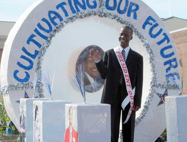 Pulled by a city fire truck, Riceboro’s float had a forward-facing teen depicting Obama underneath a banner that read “cultivating our future.” Likenesses of local African-American trailblazers surrounded. Facing backward was a rice-crop plantation scene, a photo of King and a banner that said, “remembering our past.”