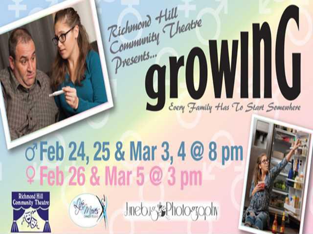Richmond Hill Community Theatre rings in 2017 with "Growing," a comedy by Steve Mason. Mason is also directing the production, which is being staged at Life Moves Dance Studios, Feb. 24-26 and March 3-5. Tickets are on sale now.