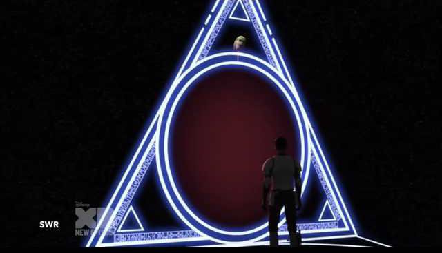 In the scene, hero Ezra finds an ancient Jedi temple. He opens a door and finds a moving mural, which is actually a doorway to many paths across time and space.