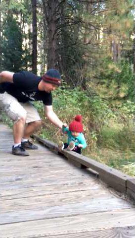 This dad was hanging out with his family on what looks like a hike when his little girl topples off the bridge they're standing on. The mom reacts accordingly with a gasp as she watches her own offspring flirting with disaster. Her mind, I'm sure, immediately goes into thoughts of concussions, stitches, short-term memory loss and all other kinds or worst possible scenarios.
