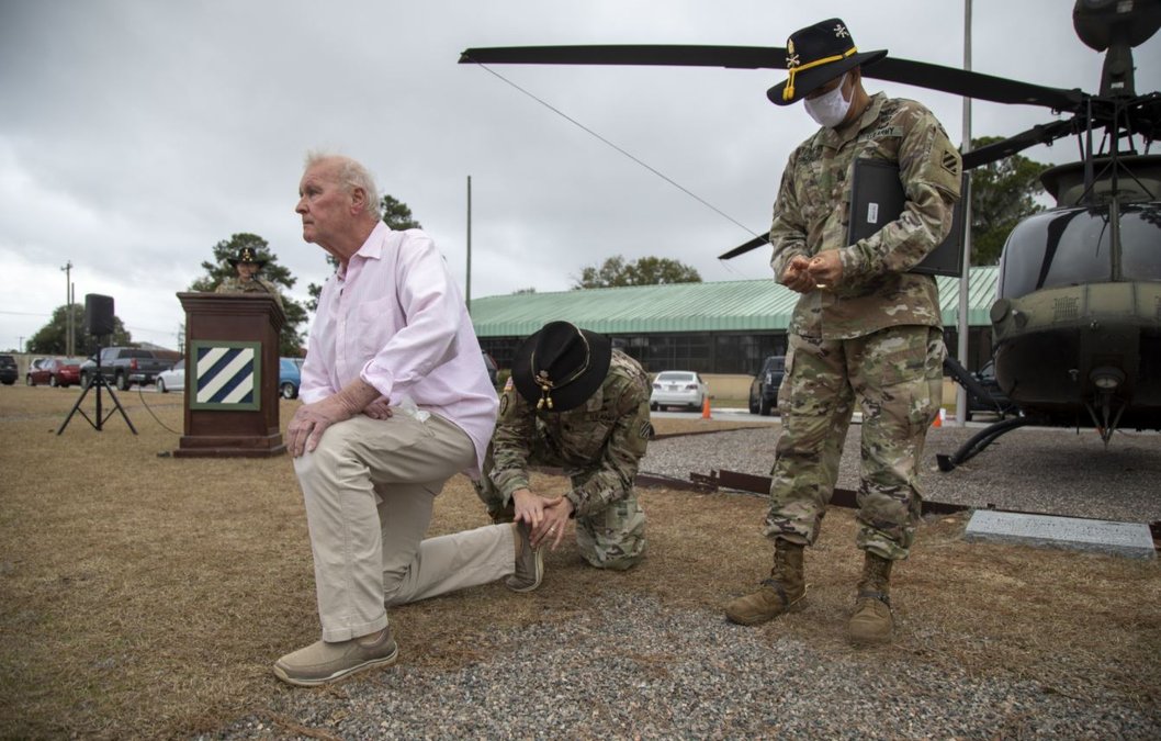 Leaders and Soldiers from across the 3rd Combat Aviation Brigade, 3rd Infantry Division, gathered to witness Lothar “Joe” Funke, a U.S. Army Vietnam War Veteran, receive his gold spurs after 50 years, Feb. 17 at Hunter Army Airfield.