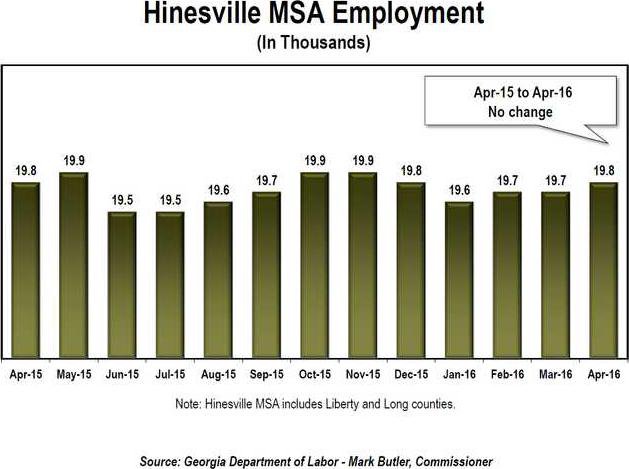 ATLANTA — The Georgia Department of Labor announced last week that Metro Hinesville’s unemployment rate for April was 5.3 percent, down 0.6 percentage point from March. The rate in April 2015 was 6 percent.