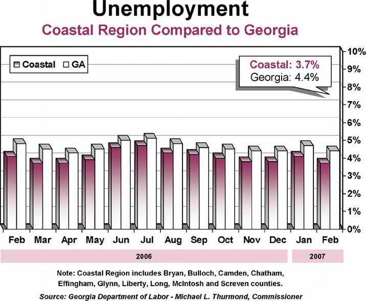 In metro Hinesville, one of the state’s 14 statistical reporting areas, the number of jobs increased 100, or one-half of one percent, from 18,300 to 18,400.