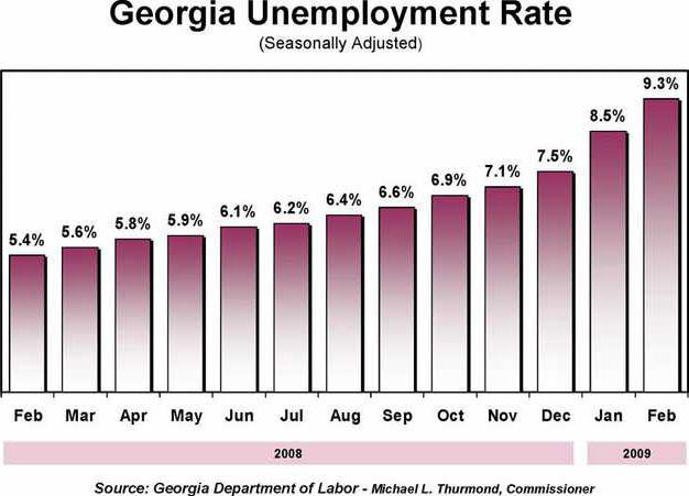 ATLANTA - The state Labor Department says Georgia's unemployment rate in February was 9.3 percent, the highest since rate-keeping was standardized by the federal government in 1976.