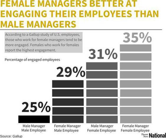 The study found that 33 percent of employees said theyre engaged at work when theres a woman at the helm, compared to only 25 percent who said theyre more engaged with a male boss.