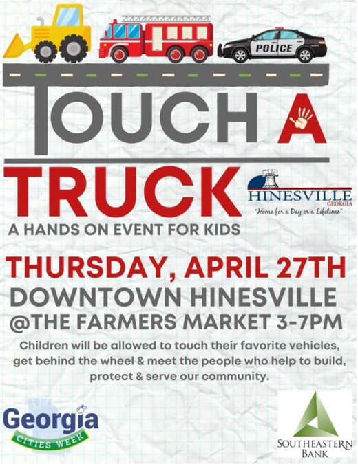 The City of Hinesville along with the Liberty County Chamber of Commerce will be hosting the “Touch-A-Truck” event April 27 from 3-7 p.m. in downtown Hinesville. This is a hands-on event for local kids and farmer’s market attendees.