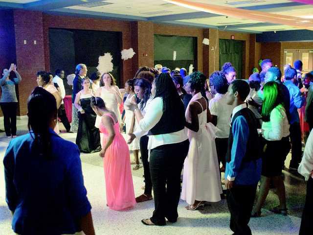 Guests enjoyed a catered dinner, and then students went on a “chariot ride.” They filed outside to the bus ramp and climbed into three stretch limousines for a ride around town. While they were chauffeured, the cafeteria was changed into a dance floor. The tables that seated guests for dinner were moved out of the way. When students returned, they walked down the red carpet again to the dance floor, although some did not wait to start dancing.