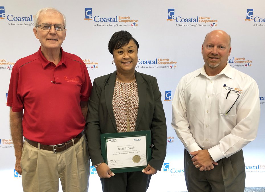 Coastal Electric Cooperative Director Holly Fields recently earned her Credentialed Cooperative Director Certificate. Board President Jack Waters and CEO Chris Fettes recognized her achievement during the cooperative’s monthly board meeting Oct. 28.
