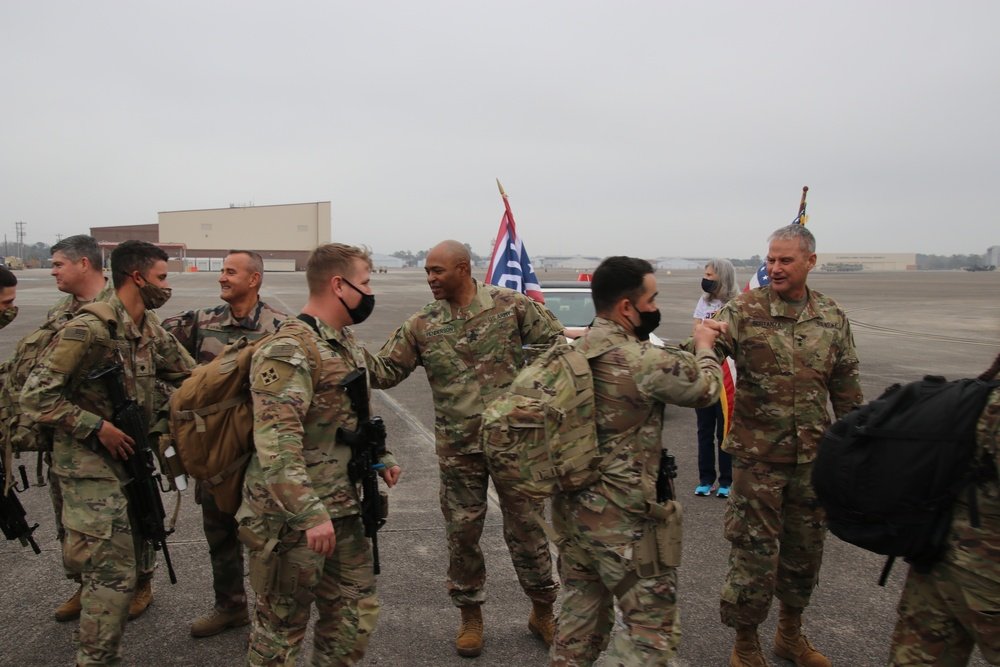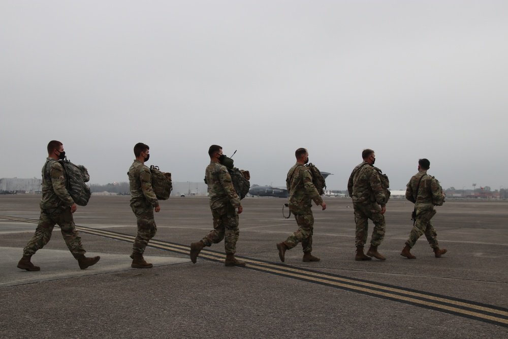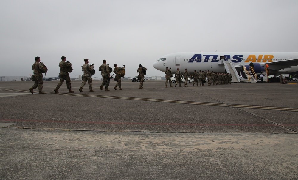 U.S. Army Soldiers assigned to the 1st Armored Brigade Combat Team, 3rd Infantry Division, deployed to the U.S. Army Europe and Africa area of operations, from Hunter Army Airfield on Feb. 27.