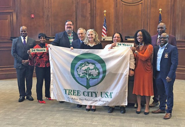 The City of Hinesville celebrated being named a Tree City USA for its 34th straight year. Joining Hinesville Downtown Development Authority executive director Michelle Ricketson are Mayor Allen Brown, council members and city clerk Lia Jones.