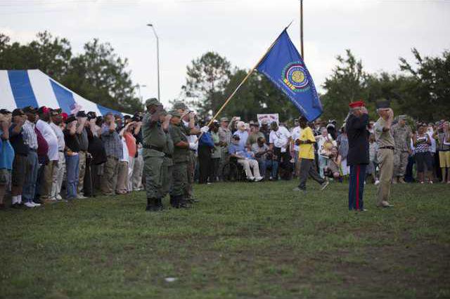 The color guard uncased a 50th-anniversary commemorative flag for the Vietnam War. As in many military ceremonies, the national anthem was played, the benediction was said, and stirring speeches were given.
