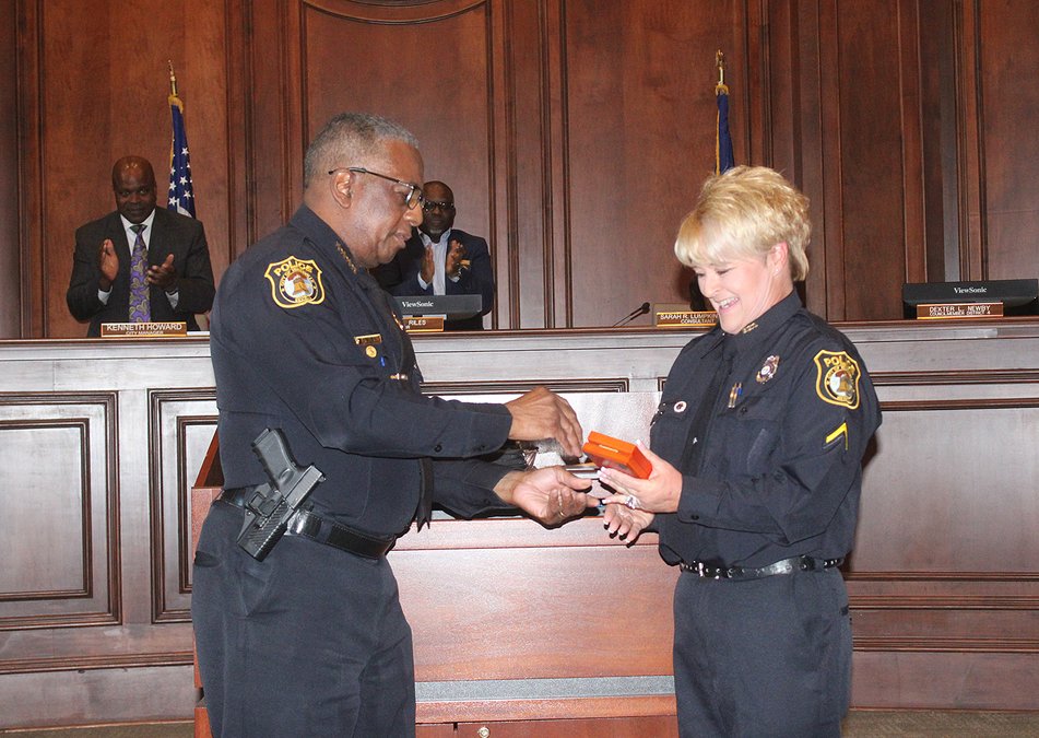 In the photo below, Chief Slater presented a challenge coin to Officer Lisa Joseph, who helped prepare the Hinesville Police Department’s documentation to become a state certified agency from the Georgia Association of Chiefs of Police.