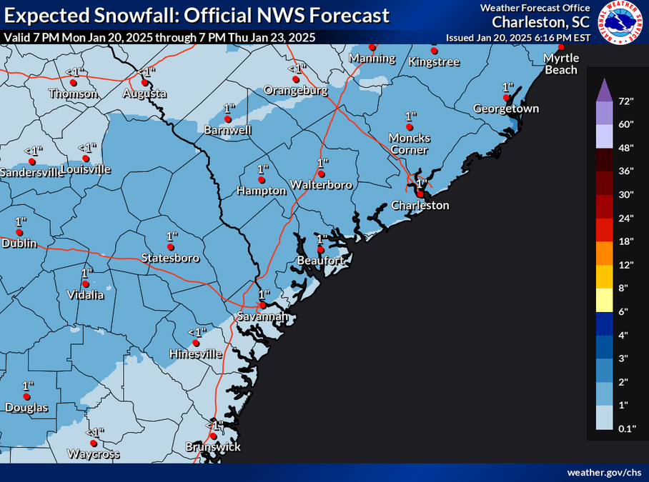 Rain in the afternoon will change to a sleet/snow mix in the late afternoon, then snow in the evening and continue overnight. Along the Georgia coast, rain in the afternoon will change to a freezing rain or sleet mix in the evening. One to two inches of snow is expected for most regions with locally higher amounts possible. As much as a quarter-inch of ice is expected along the Georgia coast.