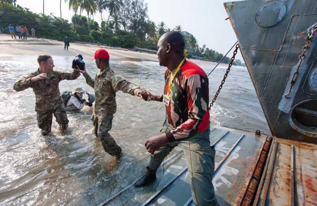 The 2IBCT, 3rd ID public affairs team, other military journalists, and I set out early in the morning to get to the landing zone at Pointe Denis, which is across the Gabon Estuary from Libreville, the nation’s capital. After a few attempts, we eventually found the site where the landing craft was going to pick us up on a beach, along with other military personnel and supply vehicles.