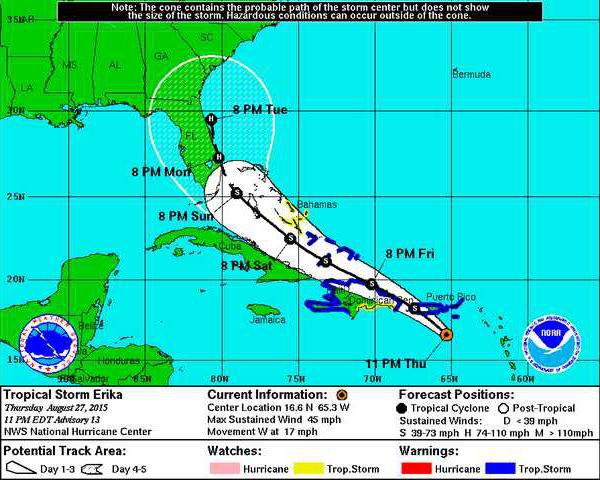 A tropical storm warning has been issued for much of the Caribbean, including Puerto Rico, the U.S. and British Virgin Islands, and the northern border of the Dominican Republic’s northern border with Haiti, the southeastern Bahamas and the Turks and Caicos Islands, and a tropical storm watch has been issued for the Dominican Republic from Isla Saona to Punta Palenque and the central Bahamas. The National Hurricane Center advises that interests elsewhere in the Dominican Republic and Haiti should monitor Erika’s progress.