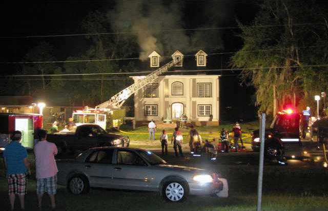 Mock said that when first units arrived on the scene, they found flames coming through the roof and window gables on the house’s third-floor/attic. Mock said firefighters tried to attack the blaze from inside the home, but the third-floor ceiling fell on the men and they had to exit the structure.