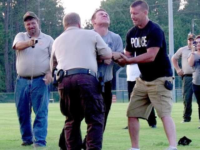 Several new law-enforcement officers from the sheriff’s office and the Ludowici Police Department volunteered to get shocked during the stun-gun demonstration. Though each of them grimaced in pain as they hit the ground, their fellow officers all laughed and smiled, remembering when they went through the same ordeal.