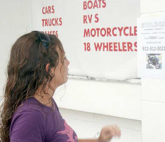 Melanie Albright spent Friday morning wallpapering Hinesville with signs offering a reward for information about her husband’s motorcycle, which was stolen from the couple’s driveway Thursday.