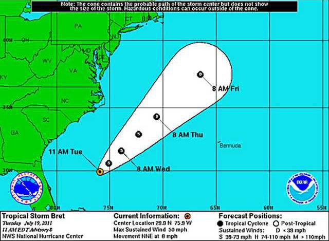 MIAMI — Tropical Storm Bret was moving slowly north-northeast from the Bahamas and forecast to stay away from the U.S. East Coast, the National Weather Service reported this morning.
