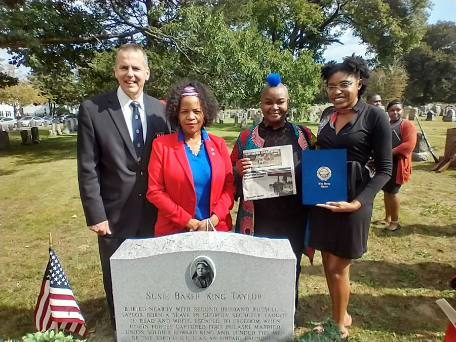 Hermina Glass-Hill, founder and executive director of the Susie King Taylor Women's Institute and Ecology Center, attended the event to represent the state of Georgia and Taylor's hometowns of Midway and Savannah. The event was held at Mount Hope Cemetery in Boston, Massachusetts where Taylor is buried. It was sponsored by the Department of Massachusetts Sons of Union Veterans of the Civil War (SUVCW), a fraternal organization descended from the Grand Army of the Republic (G.A.R.) and dedicated to preserving the history and legacy of heroes who fought to save the Union and end slavery.