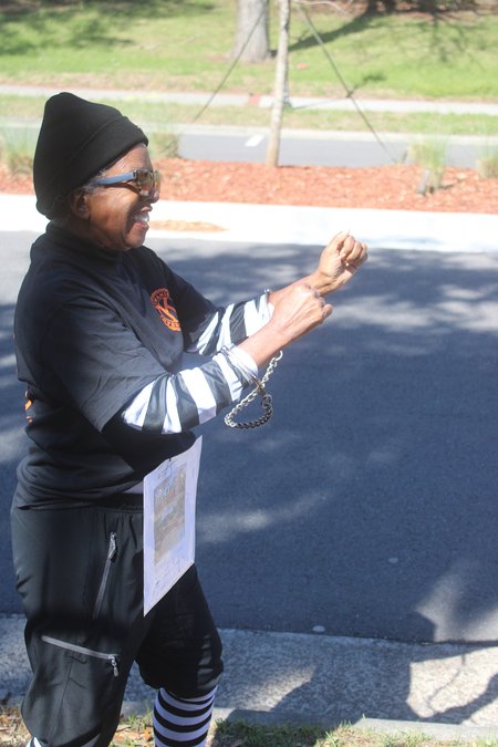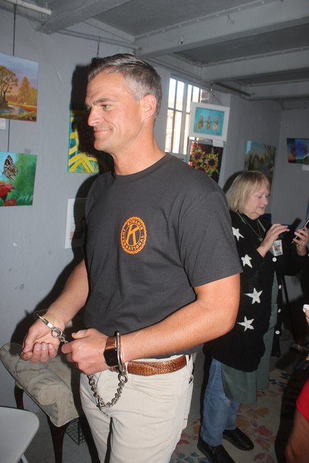 In the above photo, Charm Reed works to get out of her “prison sentence” and Derek Rozier (below photo) makes a “perp walk” during the Kiwanis Club of Liberty County’s annual “Jail and Bail” fundraiser.