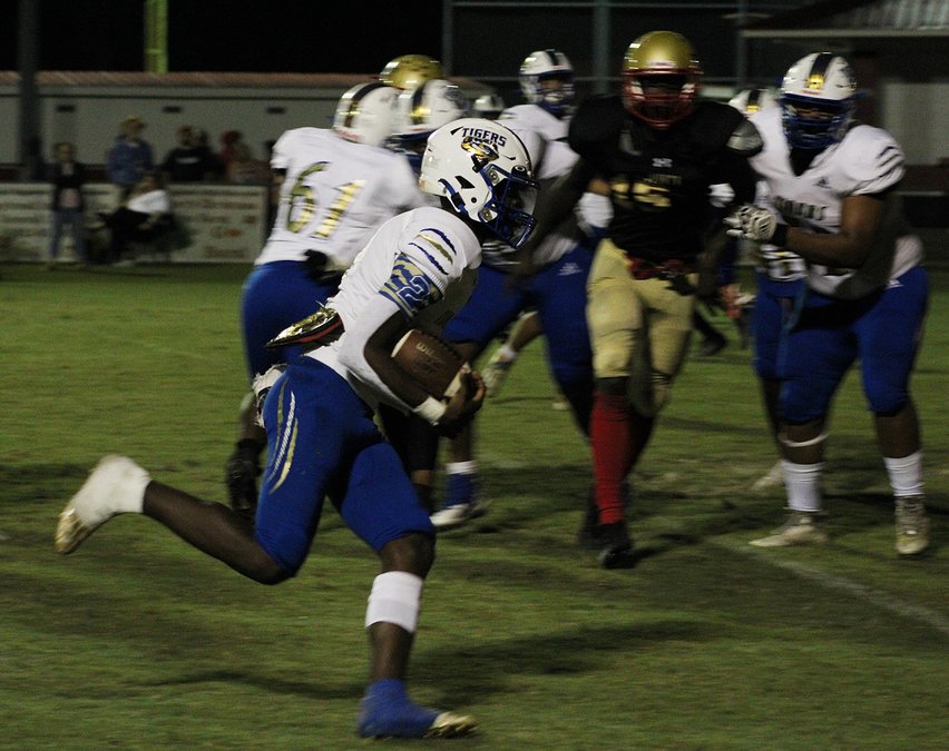 The Bucs delivered a back-breaking score off a turnover on the final play of the first half. The Tigers reached the Buccaneers 7-yard line in the waning seconds of the half when Christopher Garrett’s pass to Bryant Thomas was just out of his reach. But it wound up in the hands of MCA’s Demonte Stokes, who raced 97 yards for a touchdown as the half ended, putting the Bucs ahead 20-7.
