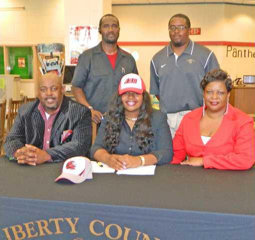 Liberty County High School Lady Panther shot put and discus champion Courtney Bennett penned her name to a track scholarship for Jacksonville State University on Monday afternoon at the LCHS media center.