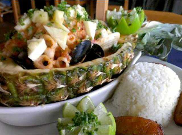 Today’s restaurant dish interprets a Barbados treat, Seafood in Pineapple. I found the tasty mélange of seafood, tangy pineapple and creamy sauce at Rancho Alegre — one of several new special menu dishes offered daily.