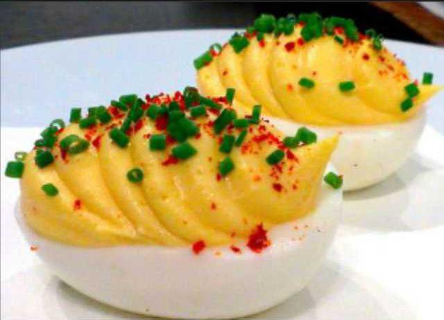 I also sampled a pair of deviled eggs, served picture perfect with decoratively pied in yolk and a delicate topping of minced chives. Deviled eggs were on nearly every menu on a recent trip to Atlanta but have scarcely showed on Savannah’s radar.