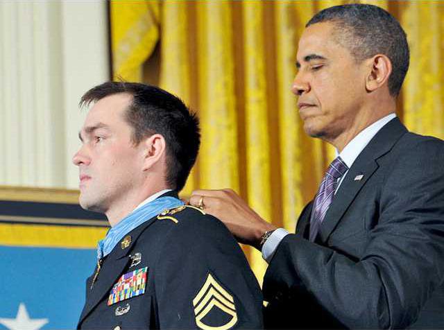 The president then asked that the Medal of Honor citation be read, and following that, he placed the medal around Romesha's neck.