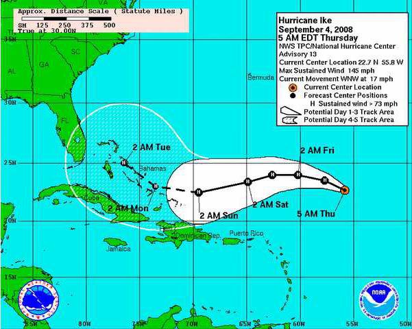 At 5 a.m. EDT Thursday, Ike had maximum sustained winds near 145 mph (230 kph). The National Hurricane Center in Miami called Ike "an extremely dangerous" hurricane.